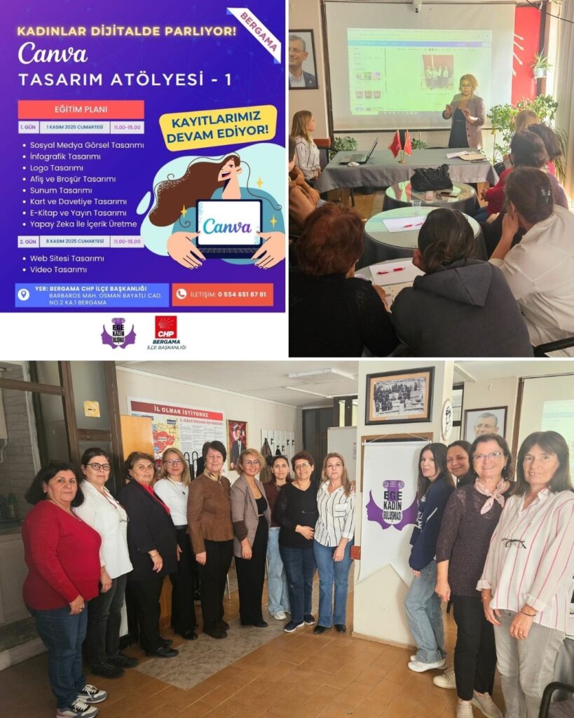 Kadınlar Dijitalde Parlıyor – Bergama Atölyesi, CHP Bergama İlçe Örgütü ve Ege Kadın Buluşması Platformu iş birliğiyle Bergama’da kadınlara yönelik Canva ve Dijital İçerik Tasarımı Atölyesi gerçekleştirdik.